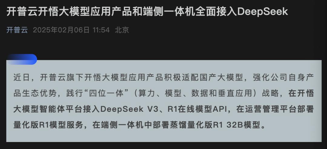 開普云則宣布在開悟大模型智能體平臺接入DeepSeek V3、R1在線模型API,在運營管理平臺部署量化版R1模型服務,在端側一體機中部署蒸餾量化版R1 32B模型。