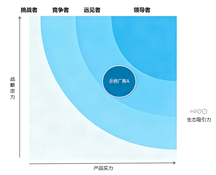 最終,我們不會簡單排出123名,而是繪制出"引力象限圖":X軸代表企業(yè)當(dāng)前的產(chǎn)品實力,而Y軸則代表企業(yè)當(dāng)前產(chǎn)品戰(zhàn)略,圓圈大小則代表生態(tài)吸引力。同時引力象限被劃分為四個區(qū)域——領(lǐng)航者、遠(yuǎn)見者、競爭者、挑戰(zhàn)者。這種二維定位比線性排名更能反映企業(yè)的真實處境。