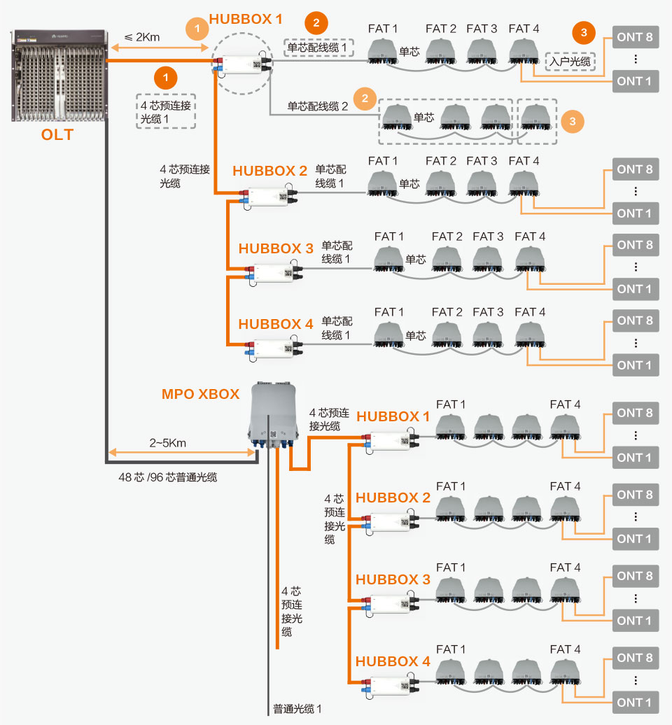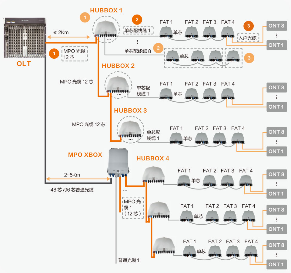 HUBBOX首先要明確其容量,該HUBBOX最多連接多少個(gè)FAT,比如每個(gè)HUBBOX可以覆蓋8組FAT,每組是4個(gè)FAT,那么HUBBOX的位置就是要距這8組FAT的平均距離最短,位置適中。