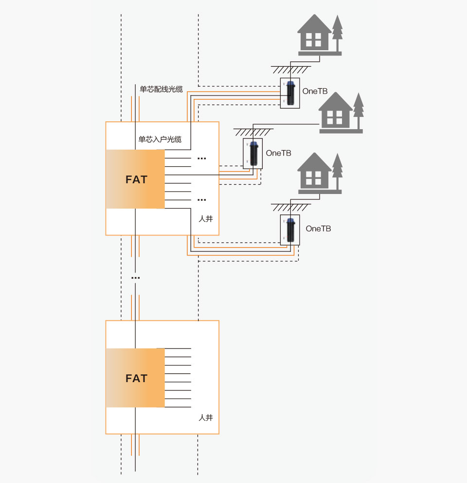 12中FAT為第二級分光器,建議安裝在人井的壁上,可根據(jù)住戶的密集程度選用8端口FAT或4端口FAT,F(xiàn)AT至用戶住址采用預(yù)連接方式,在用戶門口(墻外)布放OneTB(地平面之下)。FAT至OneTB采用預(yù)連接光纜可與配線段光纜同溝縱向布放,此段預(yù)連接光纜可外加一層保護(hù)管,到用戶門口位置再橫向挖溝,與OneTB相連。